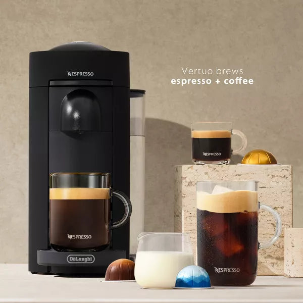 Nespresso introduces the VertuoPlus by De'Longhi, with an all-new design and colors for the ultimate brewing experience. Offering freshly brewed Coffee with crema as well as delicious, authentic Espresso, the VertuoPlus coffee machine conveniently makes 4 cup sizes at the touch of a button: 5oz, 8oz Coffee and single and double Espresso. It uses two different pod sizes: large capsule Coffee and a small one for Espresso. Nespresso brings together the know-how of all its coffee experts, who have carefully chosen the origin and roasting of each coffee blend and created a brewing system using Centrifusion technology, a patented extraction technology developed by Nespresso. Just insert a pod and close the lever — when activated, the capsule spins up to 7,000 rotations per minute, blending ground coffee with water and producing the perfect crema to enjoy quality coffee in larger cup sizes. The Nespresso machine delivers the optimal in-cup results for each blend using capsule-specific brewing with barcode reading. New features include a moveable water tank to fit different kitchen counter space, as well as a motorized opening and closing of the brew head. The VertuoPlus also comes in a deluxe premium version with extra-large water tank and capsule container and chromed details. Each machine includes a complimentary welcome set with a range of Nespresso pods Vertuo with unique aroma profiles. Order your Nespresso pods, receive personalized advice, and obtain technical support or repair for your machine through the Nespresso Club via mobile app, online at Nespresso.com, by telephone or in one of our Boutiques.