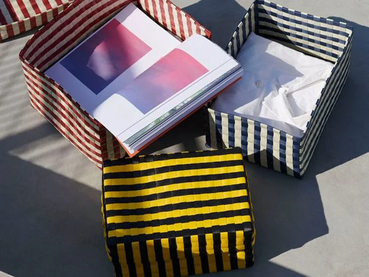 Crafted and handcrafted from recycled plastic strips, Bertjan Pot's Maxim Stripe Box is a Colorful storage box with a distinctive stripe pattern. Its durable woven structure and original design make the box a functional and decorative container for storing toys, magazines, make-up and other items. The box is available in different sizes and Colors.