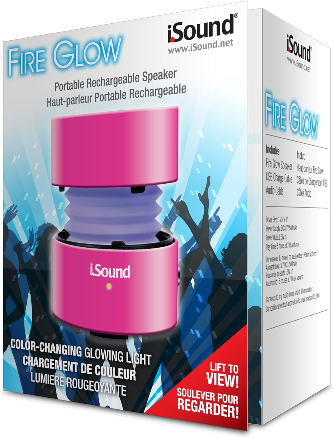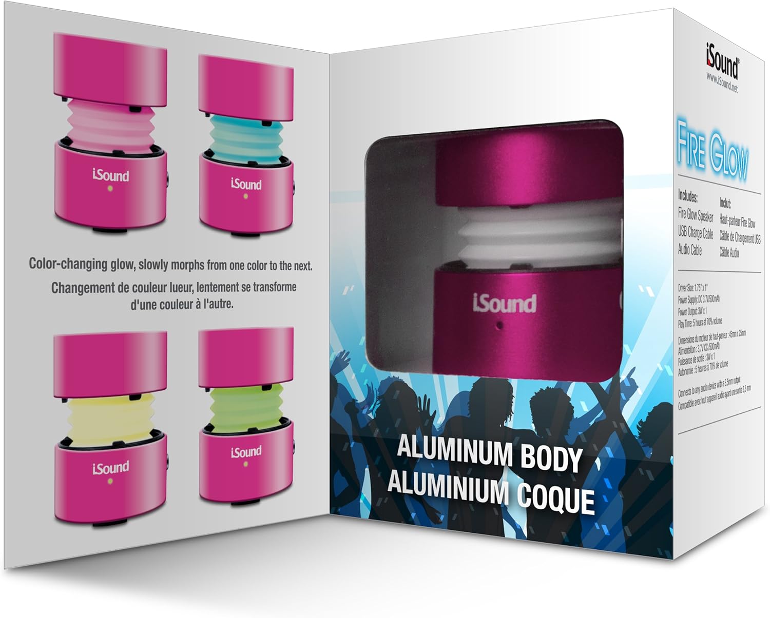 The iSound Fire Glow rechargeable portable speaker packs crystal clear sound and surprisingly powerful bass into a portable, compact and very attrdraft aluminum casing design. Simply plug your iPod, iPhone, iPad, smartphone, laptop, MP3 player or other audio device into the 3.5mm audio cable to bring your tunes anywhere. The iSound Fire Glow speaker comes with an expandable design for improved sound quality. The speaker features a Li-ion Polymer Battery which allows 5 hours of playtime at 70% volume and 40 hours of standby time. Included with the speaker is a 3.5mm audio cable as well as a USB cable for quickly recharging the built-in rechargeable battery, a full charge taking less than 3 hours. Impress yourself and others with the crystal clear sound and colorful light effects of iSound's Fire Glow. Portable, compact aluminum casing design