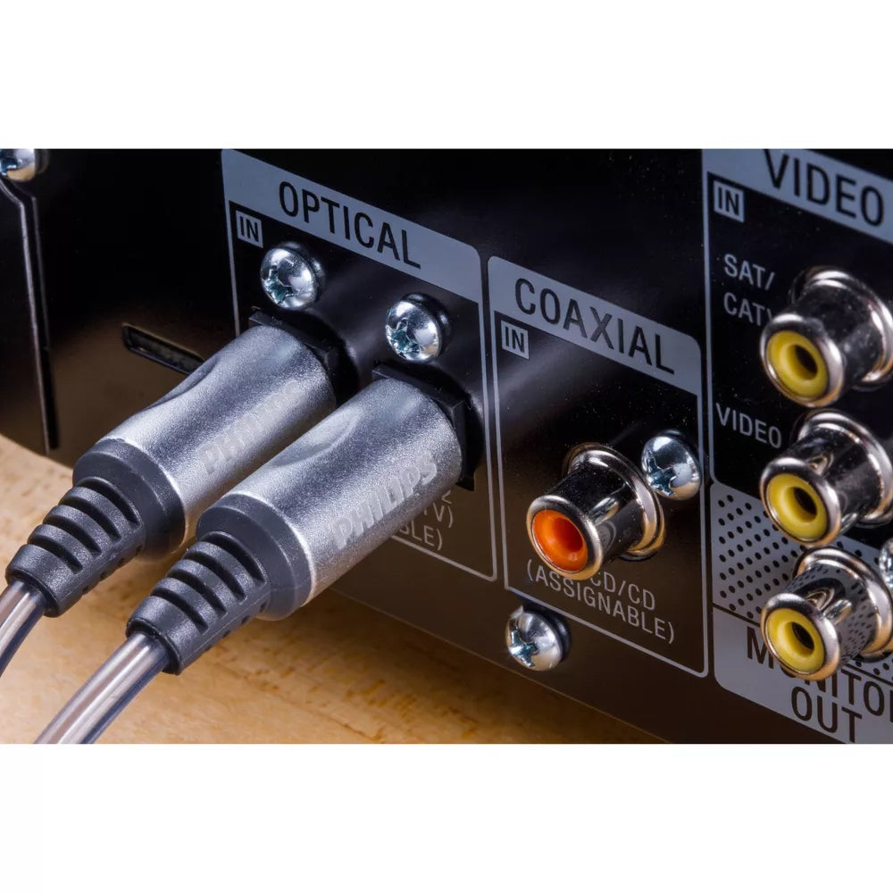 Give your home entertainment system a boost with a Philips 6ft. Elite Toslink® Fiber Optic Audio Cable with Mini Toslink Adapters. This professional-grade cable transmits superior high-definition surround sound between AV components with fiber optic inputs (TOSLINK). Rediscover your favorite movies, music and video games with fully rendered, crystal-clear surround sound from a superior audio signal. The high-grade optical fiber and lens allow you to experience the best possible performance – all without compromising sound quality.